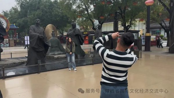 当日下午,研修班一行转场前往西安地标性文旅街区——大唐不夜城。在景区工作人员的热情讲解下,成员们沿着步行街缓缓前行,从唐代建筑风貌、非遗文化展示,到沉浸式演艺项目、夜间经济业态,全方位了解这条街区如何以“盛唐文化”为核心,打造兼具历史底蕴与现代活力的文旅IP。面对璀璨的唐风灯影、生动的文化场景,研修班成员不时驻足聆听、拍照记录,在沉浸式体验中感受西安“古今交融”的城市魅力,现场不时响起交流赞叹声,大家纷纷以合影留念的方式,定格此次陕西之行的鲜活记忆。